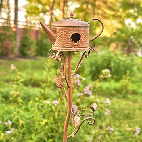 Antique Copper Teapot Birdhouse Garden Stake Square Teapot