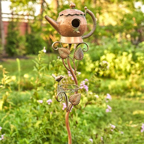 Antique Copper Teapot Birdhouse Garden Stake Round Classic Teapot