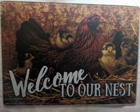 Welcome to our Nest Hen & Chicks Tempered Glass Cutting Board 12"x16"