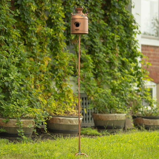 63 inch Tall Old Style Milk Can Birdhouse Garden Stake in Antique Copper