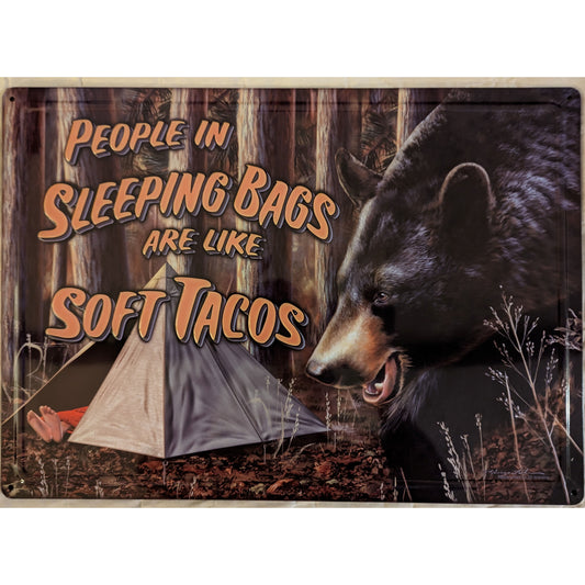 People in Sleeping Bags are like Soft Tacos - Bear Tin Sign 12"x17"