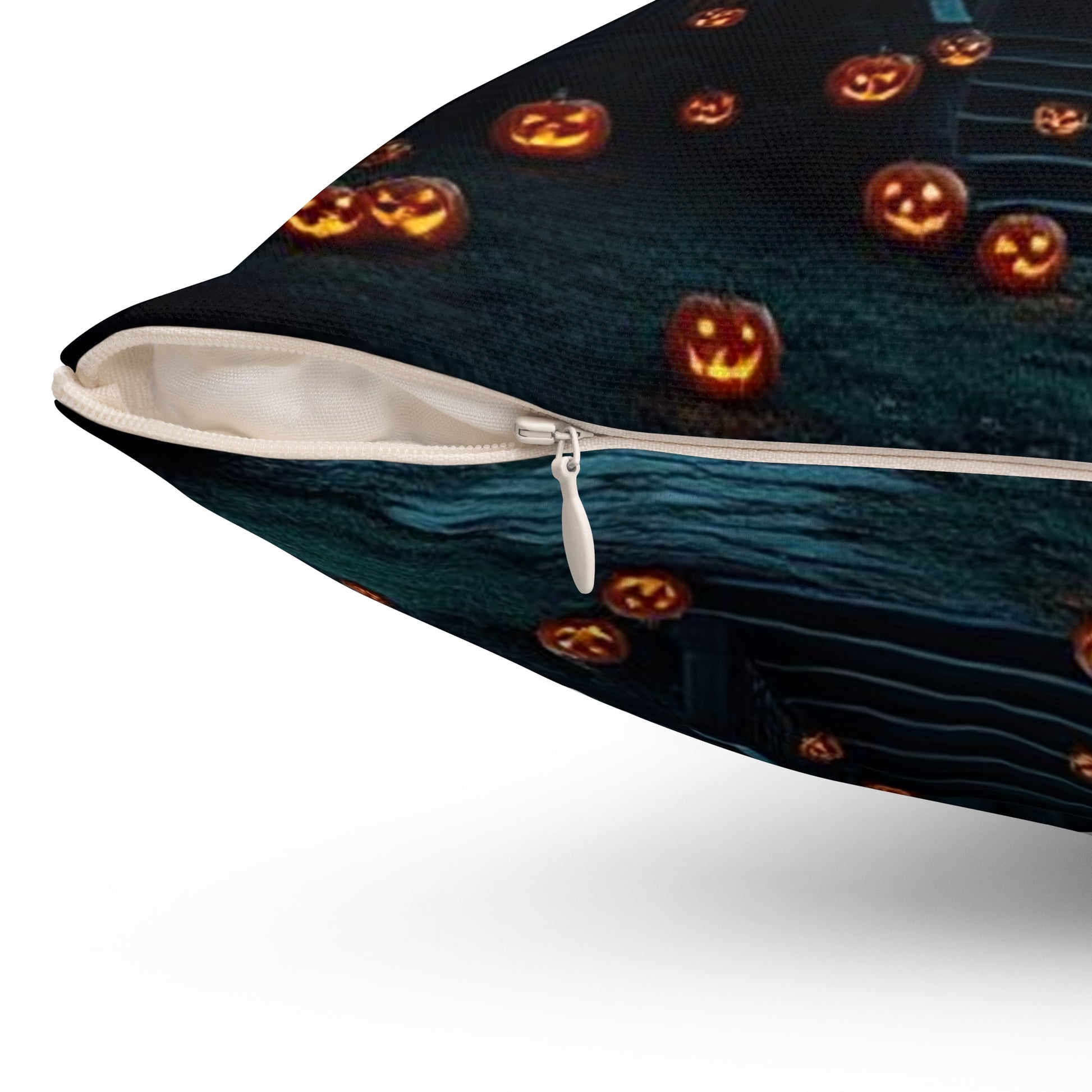 Halloween Themed Spun Polyester Square Pillow | Cozy Autumn Decor, Spooky Home Accent, Fall Cushion, Haunted House Design, Halloween Gift
