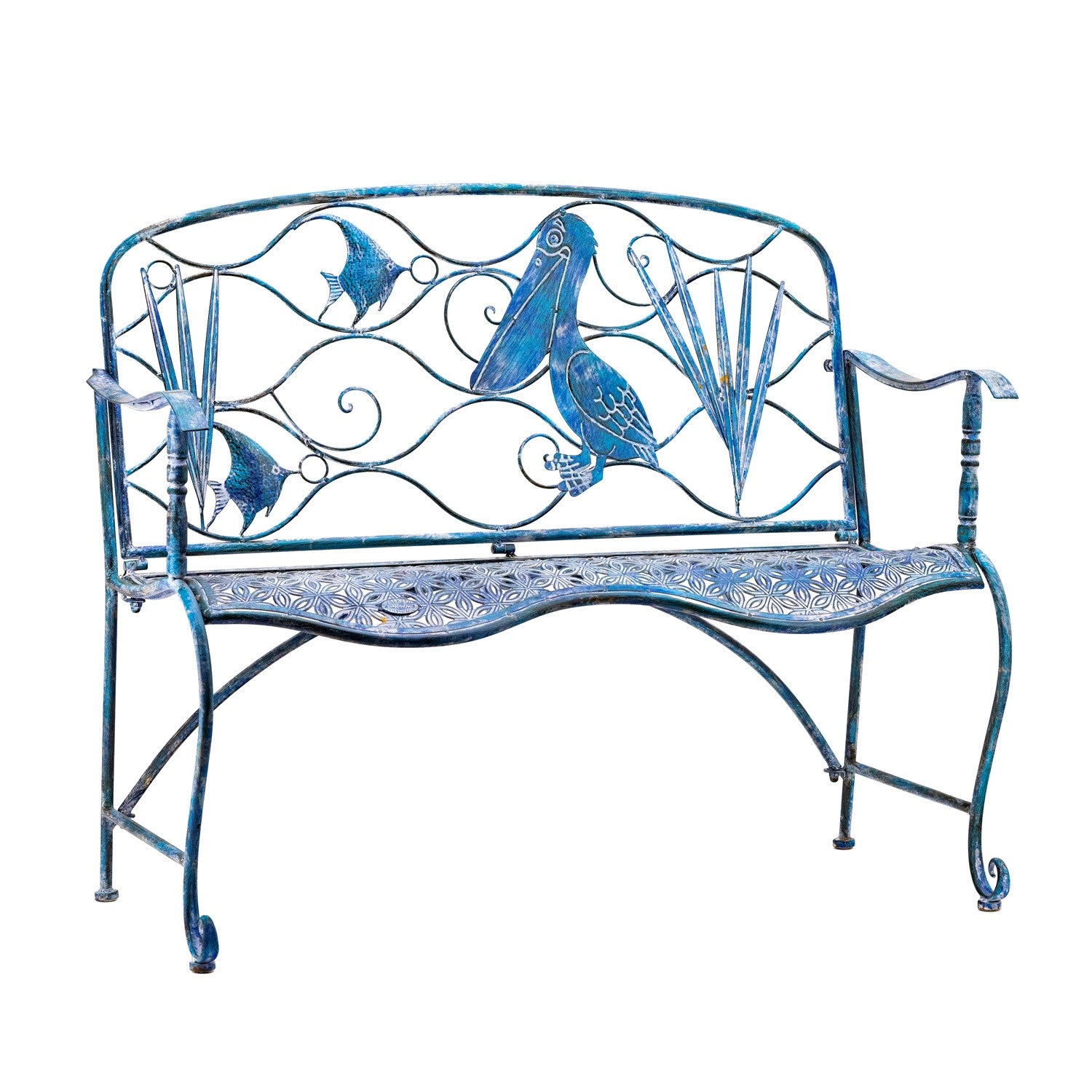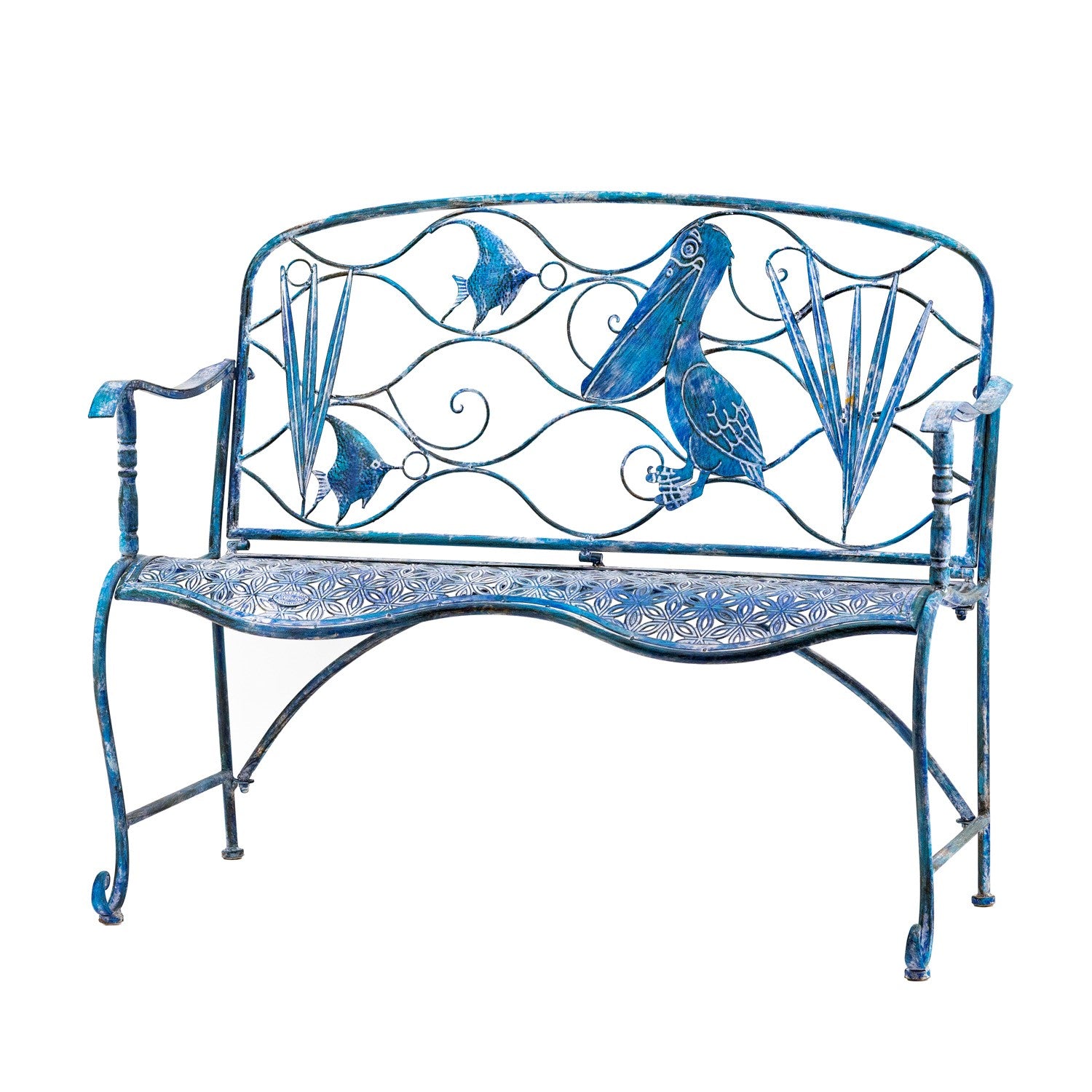 We have expanded our bestselling Coastal Collection due to its ever growing popularity. Crafted from quality powder coated iron, each coastal themed bench is hand painted in a distressed Coastal Blue finish with a curved seat that beautifully mimics the ocean. The backrest of every bench features a specific beach scene or marine life. The "Sarasota" style displays a wave-like background with a large happy pelican in the foreground, along with two angel fish.